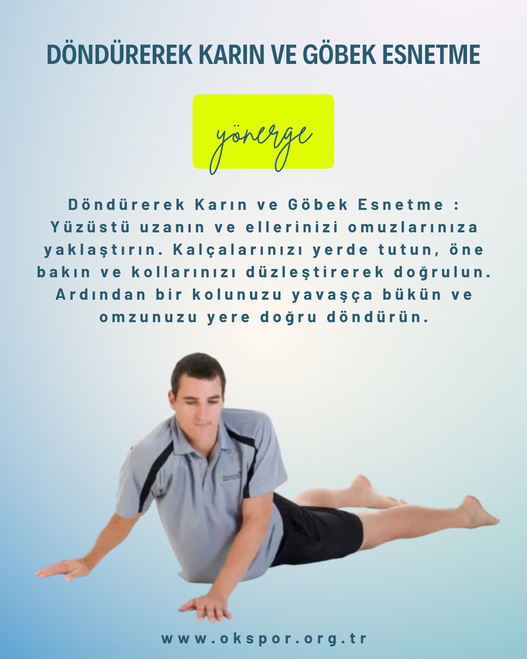Talimatlar : Yaklaşık 10 üzerinden 7'lik bir gerginlik hissedene kadar yavaşça esneme pozisyonuna geçin. Ağrı veya rahatsızlık hissederseniz, esnemeyi çok fazla zorladınız demektir; hemen esnemeden çıkın. Rahatlayıp derin nefesler alırken esneme pozisyonunu 20-30 saniye koruyun. Esnemeden dikkatlice çıkın ve gerekirse diğer tarafta esneme yapın. 2-3 kez tekrarlayın.